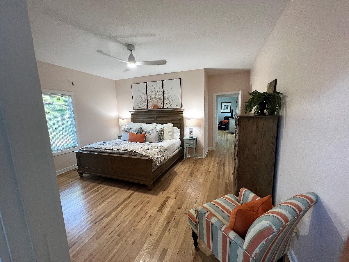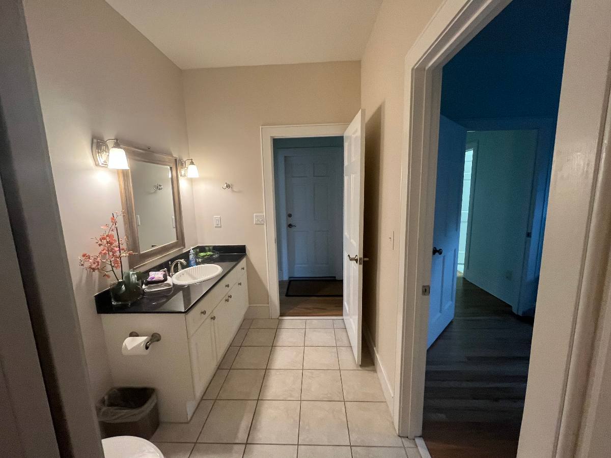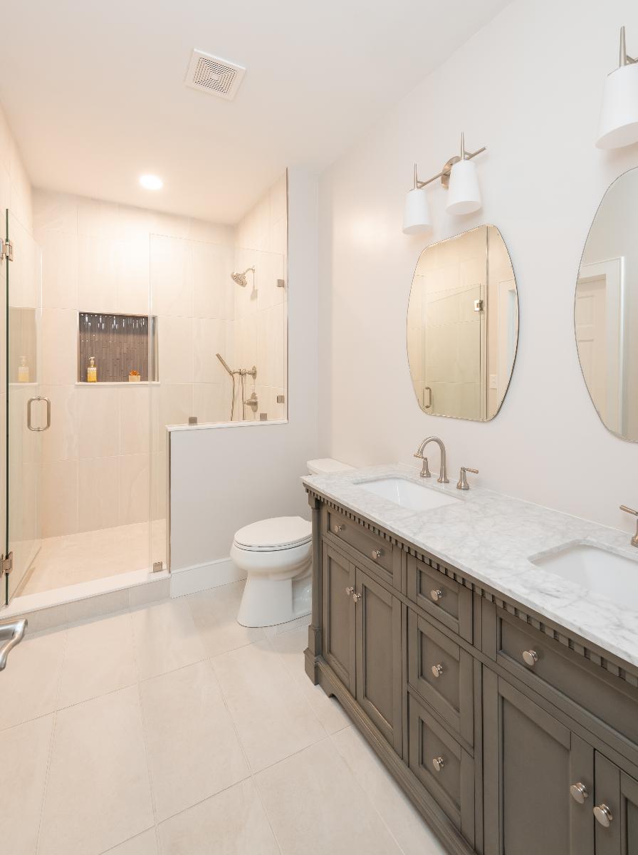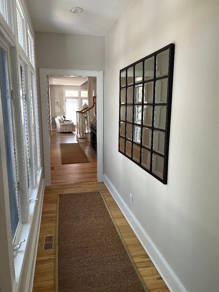 Throughout both floors, curated artwork and updated paint selections replaced dated décor with a fresh, cohesive palette. The hall bathroom was redesigned from the ground up by removing a constricting hallway and small shower to make room for a larger tiled shower with a custom glass door, along with a new vanity, flooring, lighting, and fixtures—resulting in a spa-like retreat.
