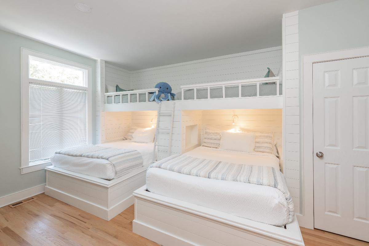 To accommodate additional guests, we designed and built a custom bed unit featuring two bunk beds over queen beds, maximizing sleeping capacity while maintaining a comfortable, inviting layout.