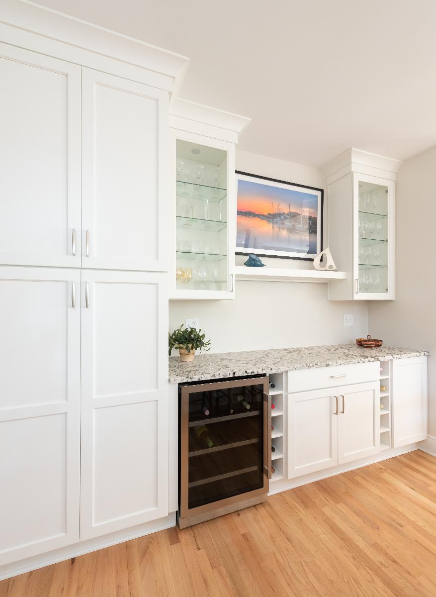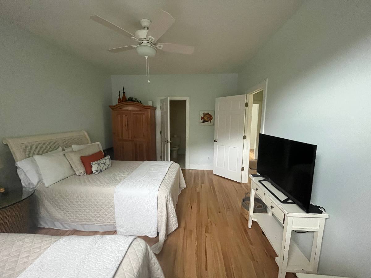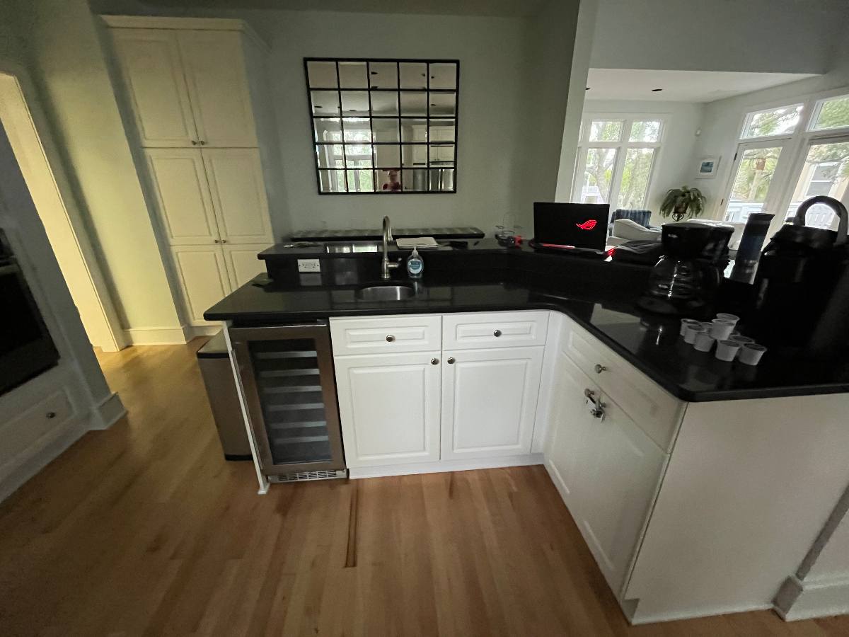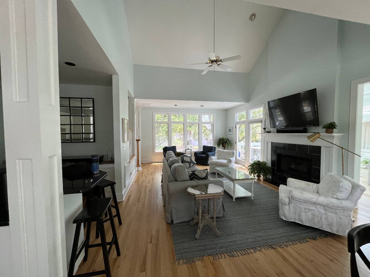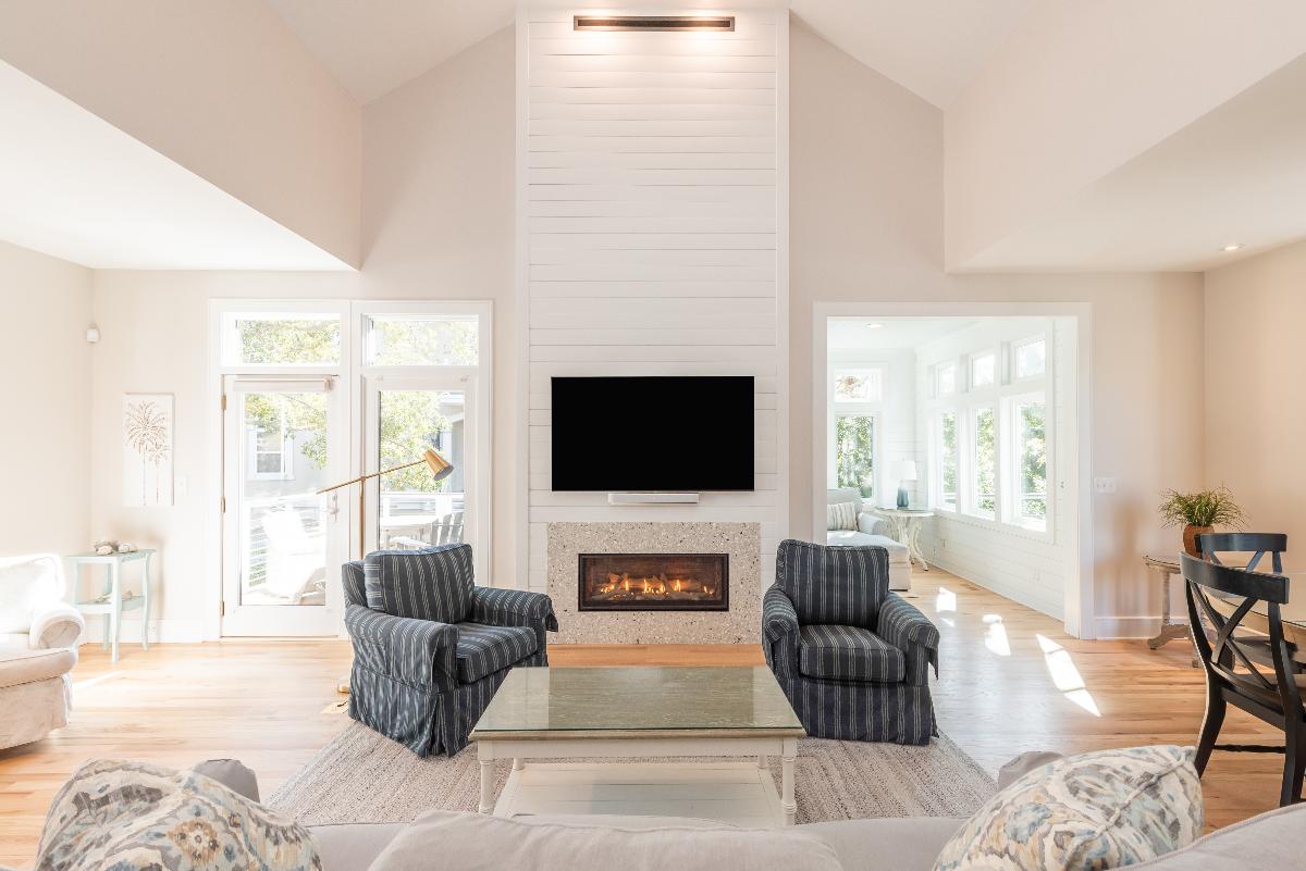 The kitchen was fully reconfigured to create a more open, functional layout and finished with beautifully stained hardwood floors. The fireplace was completely reimagined—removing the existing insert, extending the wall, and wrapping it in coastal-inspired shiplap. A new surround made from GlassEco’s composite embedded with oyster shellscreates a distinctive focal point, complemented by a 65” flat-screen TV and sound bar for an elevated guest experience.