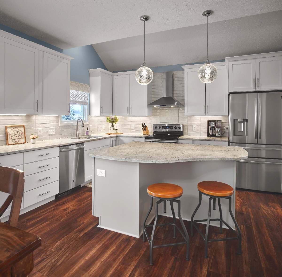 The approved design was brought to life through a kitchen transformation centered on new cabinetry, a distinctive island, and a decorative cabinet arrangement in the eating area featuring glass-front doors. We removed the existing pantry closet to eliminate the layout bottleneck and created a new mudroom-style entry from the garage directly into the kitchen, improving function and everyday organization. Complementary upgrades to key supporting spaces—including a more efficient laundry setup and a refreshed powder room—helped the entire first floor perform better. Coordinated updates throughout the home, including new paint, first-floor flooring, and refreshed stairs and railings, completed the renovation with a cohesive, finished feel.