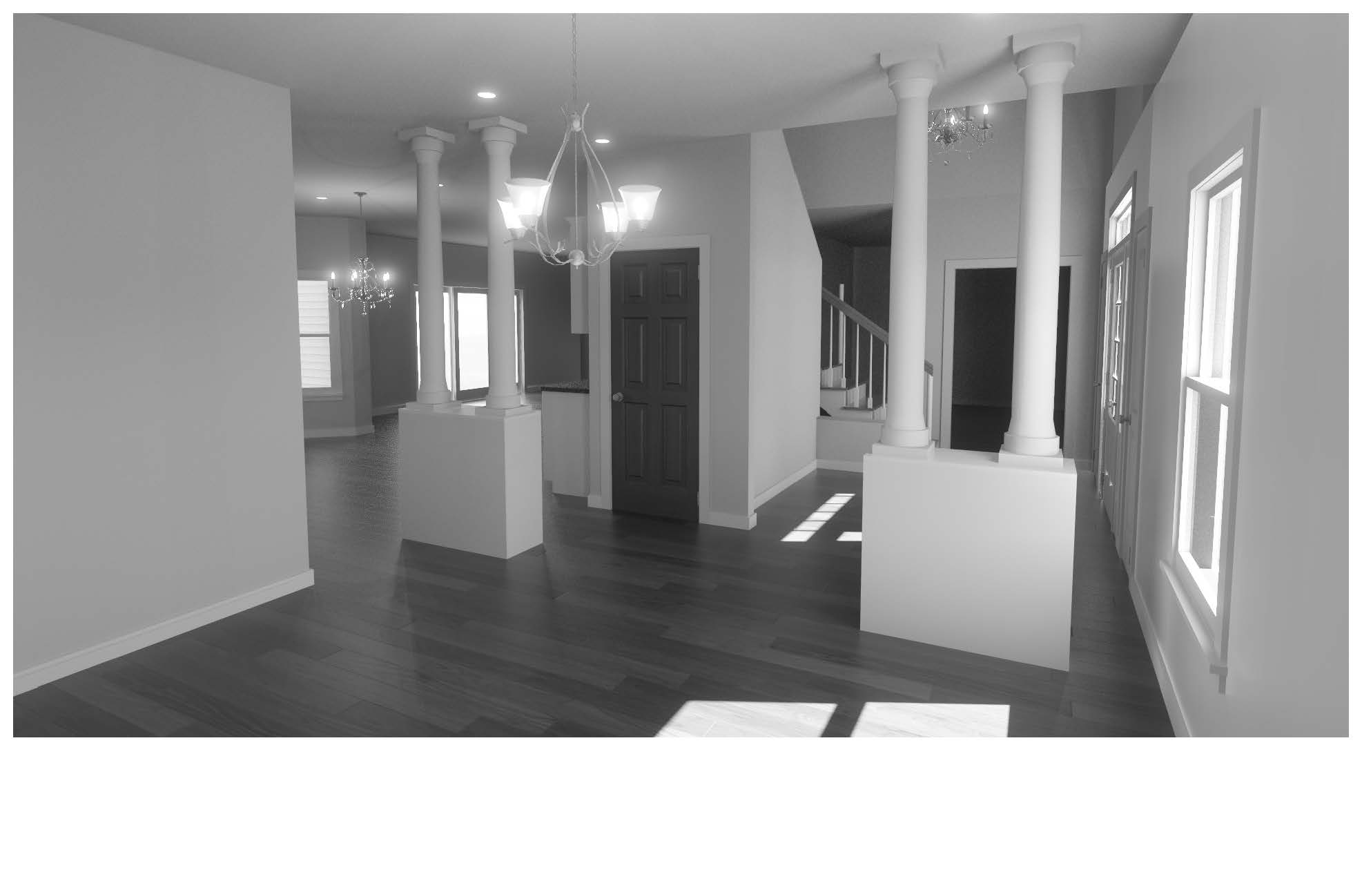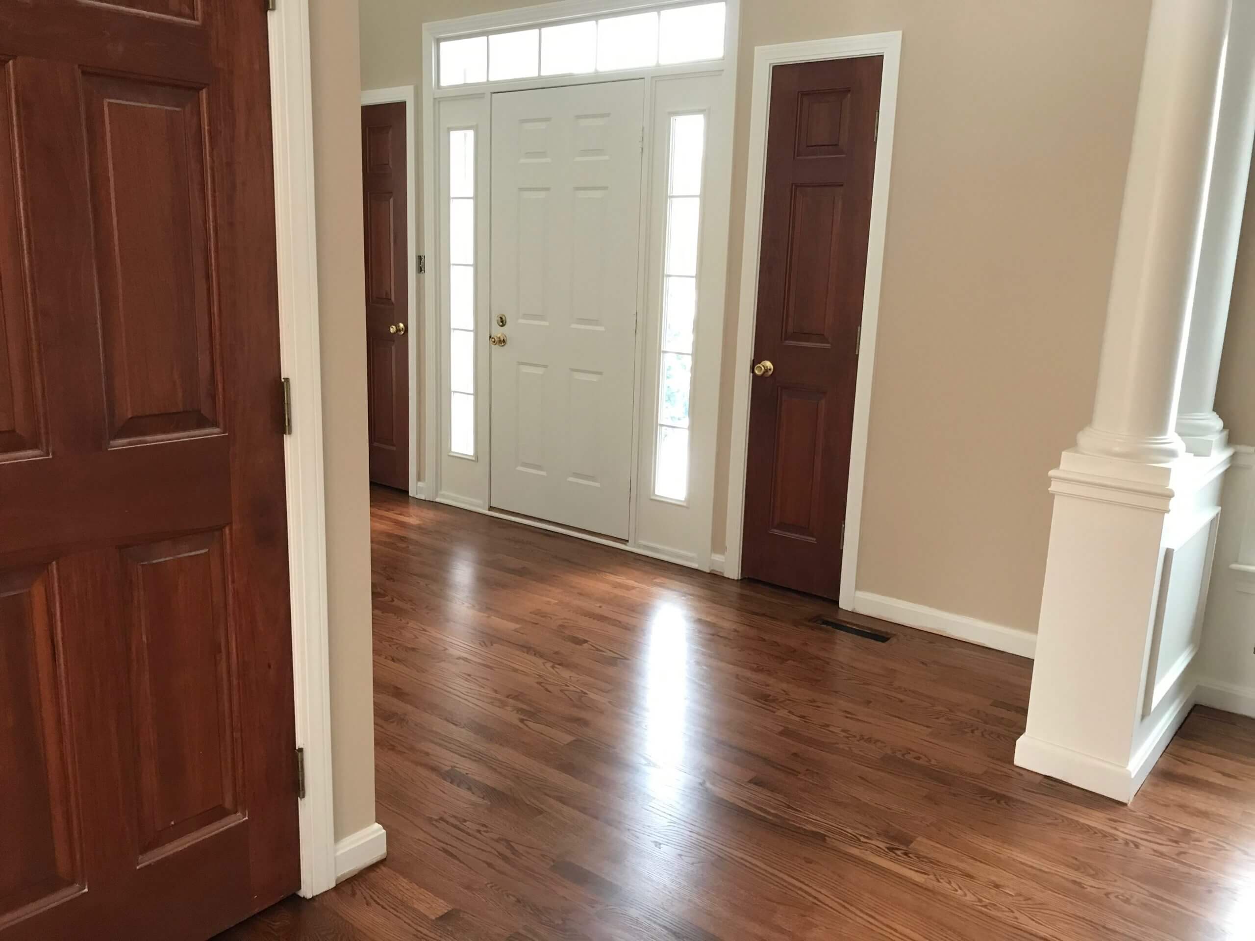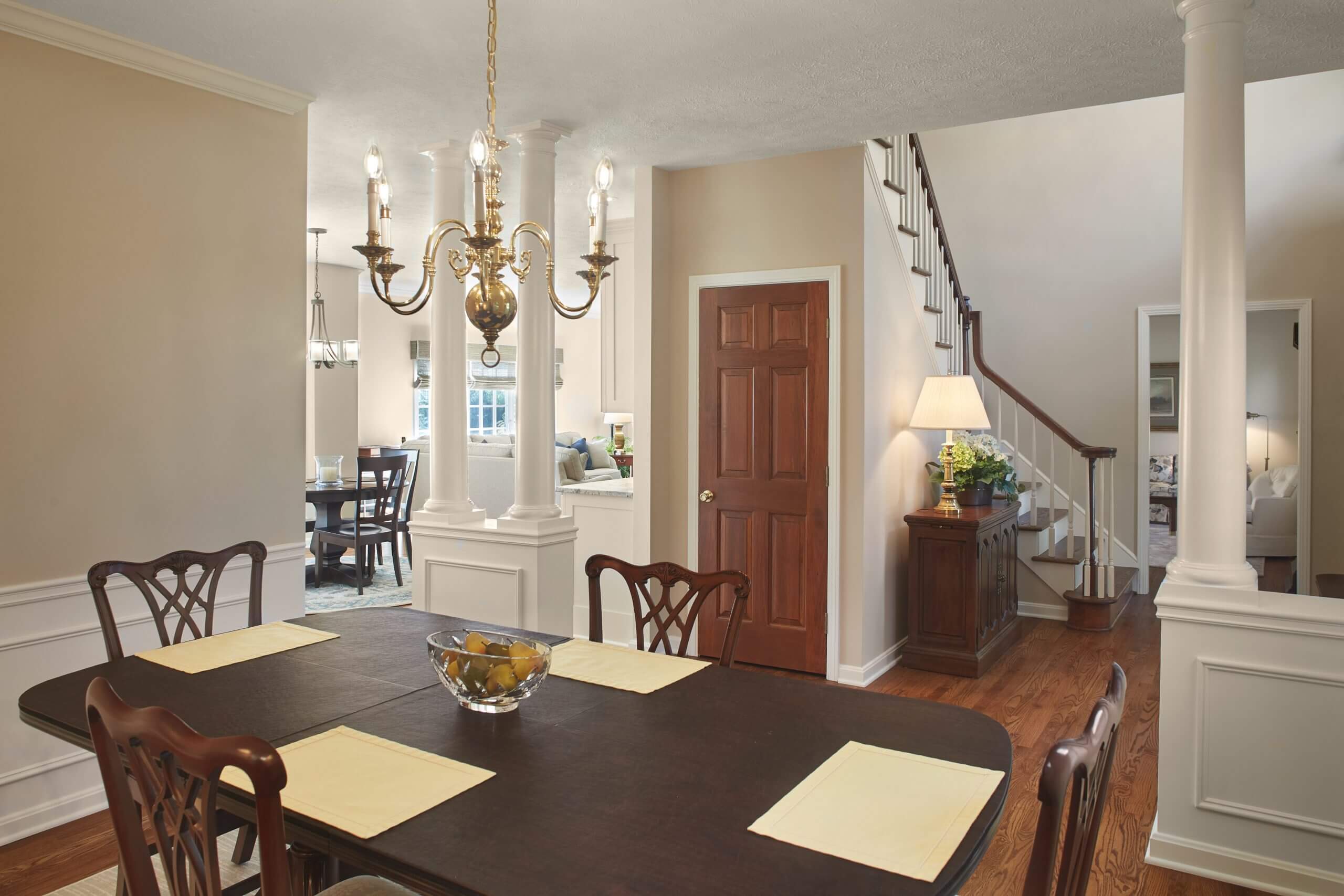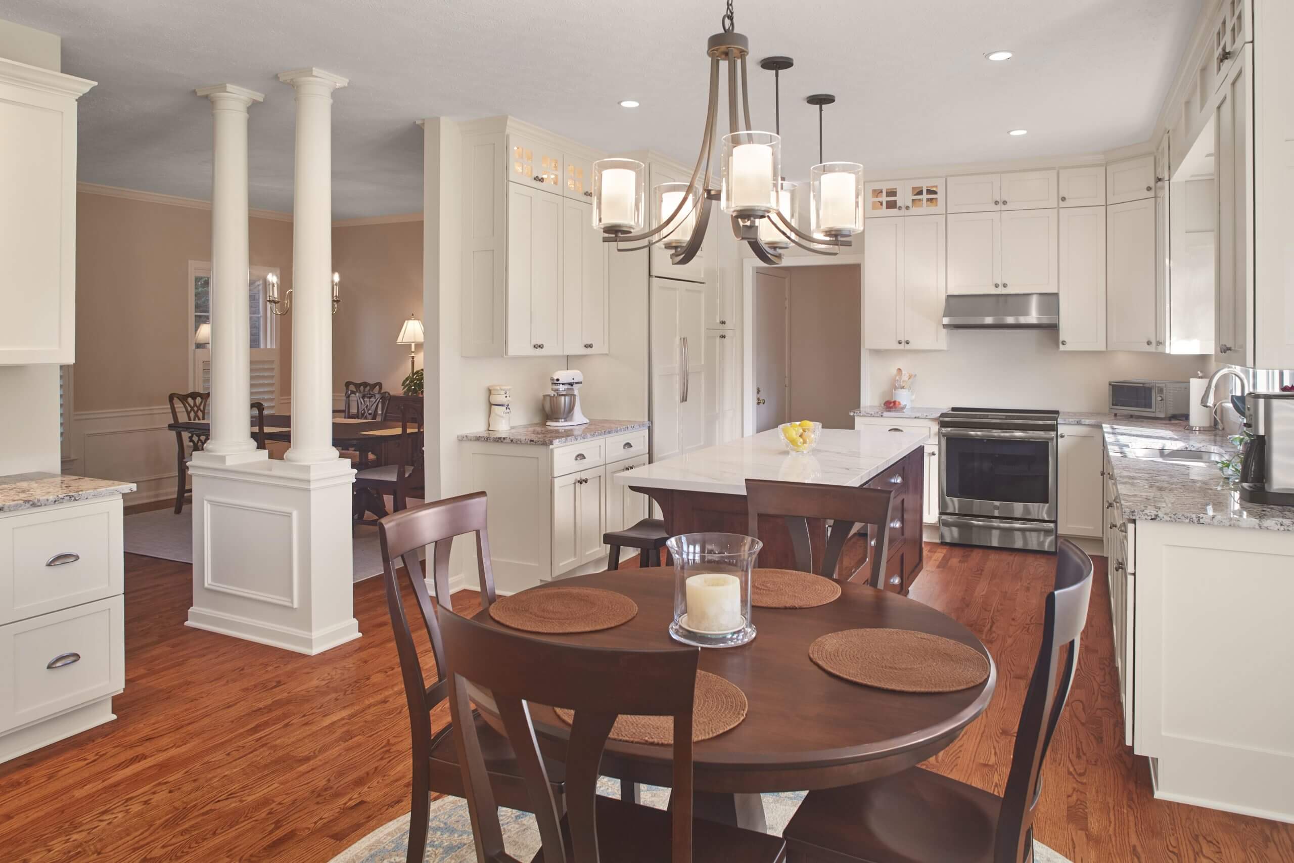 In the dining room, a load-bearing wall was removed to open the space to both the kitchen and foyer. Elegant structural columns were introduced to provide necessary support while elevating the architectural detail. First-floor carpet was replaced with hardwood to unify the main level, and all existing hardwoods were sanded and refinished with a modern stain, giving the home a clean, cohesive, and refreshed look.