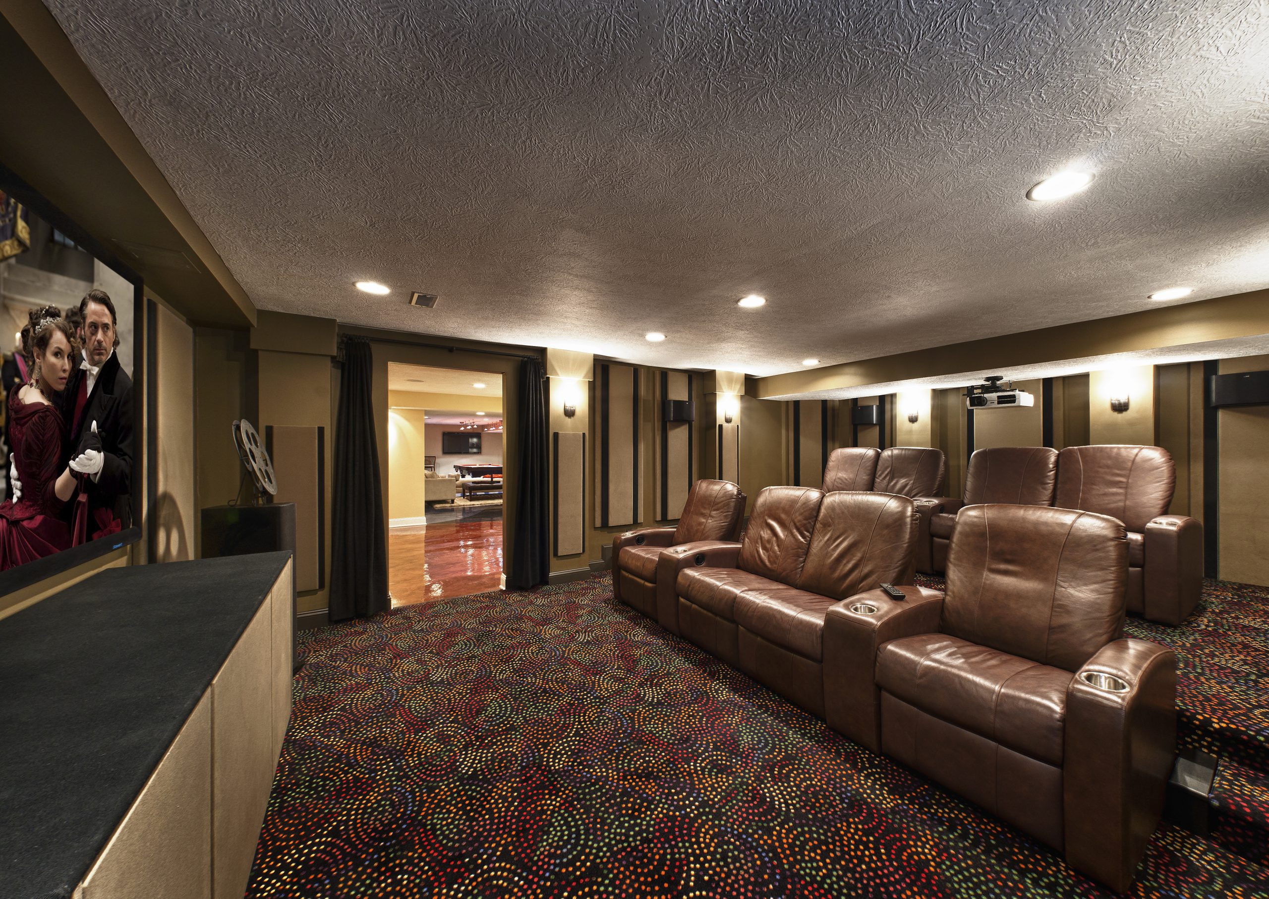 Clients lived in a country club community and wished to renovate their 20-year-old homes basement. Their original wish list included Home Theater, Bar, Card Area, Pool Table area, and putting green. The clients upgraded the putting green to a full feature golf simulator, which required excavating 3 feet of existing basement floor and replacing two outside walls to achieve a 10 ceiling height. Challenges included numerous structural posts, HVAC ducting in prime ceiling areas, and a water meter coming out of the wall in the theater. Different colored epoxy floor finishes were used to create the different spaces, separated by a faux golf path. To compensate for low ceilings, a glass wall was used to separate the simulator from the entertainment area, creating the illusion of a larger space. An actual photo of the house from the fairway was printed onto indoor/outdoor carpet on the other wall. The equipment cabinet for the theater was installed in the front wall to conceal an unsightly water meter protruding from the wall.
